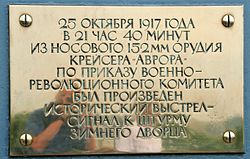 Залп с крейсера «Аврора» 25 октября 1917 года стал символическим сигналом для начала штурма Зимнего дворца. Кроме того, с этого корабля по радио было передано воззвание, написанное В. И. Лениным, под названием «К гражданам России!»[24][23].