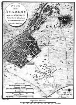 Слово Академия происходит от имени античного мифического героя Академа (греч. Ἀκάδημος), в честь которого был назван пригород Афин где в середине 380-х годов до нашей эры Платон основал Платоновскую философскую школу, где научные исследования совмещались с преподаванием на основе диалектики, разработанной Платоном в диалогах. Члены этой академии, учителя и ученики, жили совместно, занимаясь научной работой во всех основных областях знания[2][3]. С 388 года до тенистые аллеи Академии служили любимым местом прогулок Платона, который любил здесь беседовать с своими учениками и друзьями и поучать их. Даже после смерти Платона, который был погребён недалеко от Академии, последняя оставалась средоточием его школы, которая поэтому и получила название Академической[4]. Академия просуществовала на своём историческом месте девятьсот лет с 385 года до нашей эры по 529 год нашей эры. Она была закрыта византийским императором Юстинианом I за её языческое и антихристианское содержание деятельности[5][6].