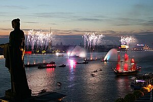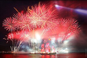 | Проход корабля с алыми парусами в сопровождении фейерверка | |