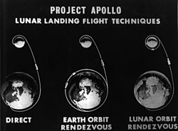 - третий вариант, предложенный одним из ведущих специалистов НАСА Джоном Хуболтом, позволял выводить на околоземную орбиту полезную нагрузку с оптимальной массой. На Луну нужно садиться в небольшом посадочном модуле, оставив на лунной орбите командно-служебный модуль (КСМ) с ракетной ступенью для полета к Земле. В итоге вариант Хуболта был принят как рабочий и было решено, что командно-служебный модуль, в состав которого входит возвращаемый на Землю отсек, а также топливо и двигательная установка, необходимые для возвращения, остаётся на лунной орбите, а прилуняется и взлетает с Луны только отделяемый от основного корабля лунный модуль (ЛМ)[7].