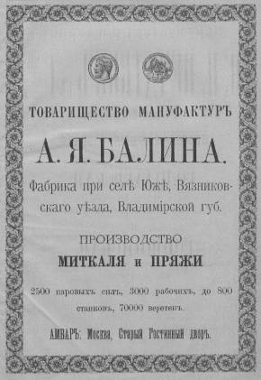 Помимо Южской фабрики, семье Балиных принадлежала и «Шуйско-Тезинская мануфактура», открытая в 1840-х годах XIX века И. Ф. Поповым[7].