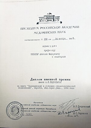 В 1993 году за монографию «Премедикация в условиях стоматологической поликлиники» президиумом Российской академии медицинских наук был удостоен именной премии имени А. И. Евдокимова.