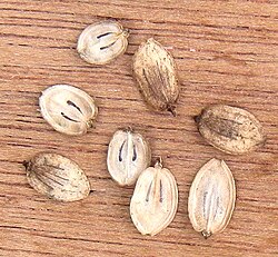 Плоды — вислоплодники, распадающиеся на два мерикарпия. Со спинки сильно сплюснутые, яйцевидные, обратнояйцевидные до округлых или эллиптических[9]. На спинке полуплодиков слабо заметные рёбра, и хорошо выраженные эфиромасличные канальцы не доходящие до основания мерикарпия на дорзальной стороне.