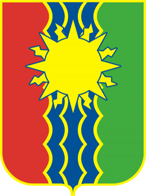 Герб города Братска представляет изображение в рассечённом червлёно-зелёном поле лазоревый выщербленный столб, имеющий внутреннюю и наружную золотые тонкие каймы, и поверх всего в почётном месте — золотое солнце (без изображения лица) с изломанными огненными лучами[49].