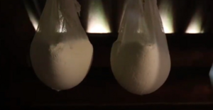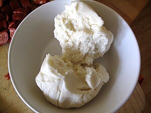 В подготовленное молоко добавляют закваску из бактериальных культур молочнокислых микроорганизмов. Для улучшения образования сгустка вводят хлорид кальция, а также молоко свёртывающий фермент, под воздействием которого и формируется сырный сгусток. Полученный сгусток осторожно нарезают на кубики большего размера (до 2 см), а затем аккуратно перемешивают, чтобы обеспечить отделение сывороточной жидкости[2].