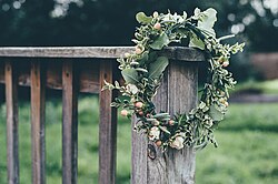 Ритуальный жатвенный венок, украшенный лентами, колосьями, яблоками, символизировал окончание жатвы. Его клали вместе с последним снопом в красный угол жилища и хранили до следующего сбора урожая. Траурный венок служил данью уважения усопшему, символизируя конец жизни и начало пути в рай, вечную жизнь[2].