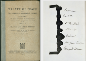 В рамках Парижской мирной конференции 28 июня 1919 года был подписан Версальский мирный договор. В этом подписании приняли участие представители Великобритании, Франции, США, Японии и Италии с одной стороны, и Германии, с другой. Советская Россия, заключившая в 1918 году Брестский мир с немцами, на конференцию не была приглашена и, соответственно, не могла принимать участие в согласовании и подписании Версальского мирного договора, хотя и внесла огромный вклад в победу союзников. Основные союзники Германии: Австро-Венгрия и Османская империя так же не принимали участие в подписании мира так как на тот момент находились в состоянии распада. Наряду с Англией, Францией и США свою подпись под документом поставили делегаты тридцати одной страны, воевавшей на стороне Антанты[3][1].