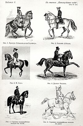 Пётр I заложил основы верховой езды как спортивного направления, демонстрируя свои выдающиеся навыки в седле и разработав первые рекомендации по управлению лошадью. По его инициативе в 1766 году в России состоялись первые официальные конные соревнования, где всадники показывали своё мастерство[29].