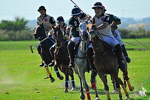 Поло — происхождение игры примерно в VI веке до нашей эры на Иранском нагорье. Формализованный командный вид спорта. Две команды по четыре всадника на травяном поле стремятся забить деревянный мяч в ворота противника. Первоначальное предназначение — тренировка для кавалерийских подразделений. Впоследствии стало популярным среди знатных сословий. По Шёлковому пути игра распространилась на Аравийский полуостров, в Индию, Китай и Японию. Исторически сложилось, что спорт был связан с дипломатией и межкультурным взаимодействием между странами[3].