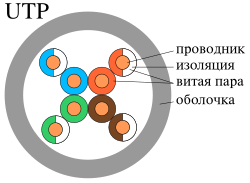 Конструктивно кабель состоит из нескольких витых пар. Проводники в парах представляют собой одножильный, либо многожильный изолированный медный провод диаметром 0,4−0,6 мм. В стандартных четырёхпарных кабелях в основном используются проводники диаметром 0,51 мм или 24 AWG (от англ. American Wire Gauge — представление диаметров жил проводов в американской системе). Свитые в пары проводники для дополнительного уменьшения влияния помех свиваются вокруг общей продольной оси и помещаются во внешнюю пластиковую оболочку, как правило из поливинилхлорида (ПВХ). Внутри кабеля иногда встроена так называемая «разрывная нить» (обычно капрон), которая используется для облегчения разделки при монтаже внешней оболочки — при вытягивании она делает на оболочке продольный разрез, гарантированно не повреждая изоляцию проводников. Также разрывная нить, ввиду своей высокой прочности на разрыв, выполняет защитную функцию от продольных нагрузок[1].