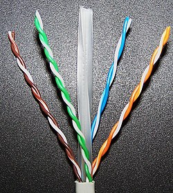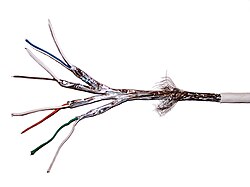 - индивидуальный и общий экран (F/FTP, S/FTP, SF/FTP): индивидуальные экраны из фольги для каждой витой пары, плюс общий экран из фольги, оплётки, или фольги с оплёткой. Защищает как от внешних помех, так и от перекрёстных помех между витыми парами.