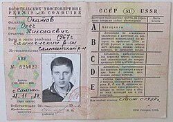 В Советском Союзе водительское удостоверение было оформлено в виде печатной книжки с фотографией и специальной зоной для печати. Все данные водителя вносились вручную. На французском языке дублировалась надпись «Водительское удостоверение». В правой части документа перечислялись пять категорий транспортных средств, начиная с мотоциклов и заканчивая грузовыми составами. В отдельном блоке нужно было ставить отметку, подтверждающую прохождение проверки. До конца 1980-х годов в водительское удостоверение вкладывался талон предупреждений. Он использовался для фиксации нарушений правил дорожного движения[4].