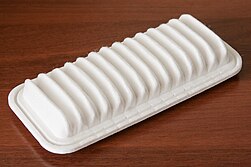 Современный автомобильный воздушный фильтр обычно представляет собой пластиковый или металлический корпус с вкладышем из складчатой фильтровальной бумаги или синтетического волокна. Складки увеличивают площадь фильтрации при компактных размерах. Фильтрующий материал пропитывают специальными составами, чтобы задерживать мелкие частицы и при этом не слишком мешать прохождению воздуха[1].