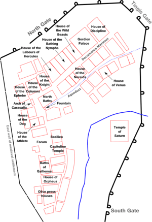 Западная часть города не раскопана. На окраинах были фермы. Богатые дома имели перистили с бассейнами и мозаики, а бедные — простые постройки. Площадь резиденций достигала 1500 м², а некоторые имели мозаики с сюжетами. В городе также находились общественные здания, Форум, термы и арка Каракаллы[3].