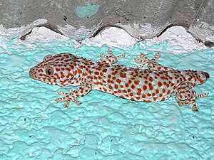 - геккон токи — тропическая рептилия, настоящая громадина среди подобных существ. Взрослая особь может достигать в длину 35—36 см и весить 150—300 г. Своё название он получил благодаря издаваемому крику, похожему на «то-ки» или «то-кей». Самцы часто имеют яркую оливковую окраску с белыми пятнами или полосами. В природе токи часто встречаются с голубоватым оттенком и оранжевыми или жёлтыми пятнами. Родина этого вида — тропические леса и предгорья Индии, Южного Китая и Камбоджи. Содержание токи в террариуме требует достаточного пространства и качественного питания. От этих факторов зависит продолжительность жизни питомца. При правильном уходе токи может прожить 10—12 лет. При контакте он занимает оборонительную позицию, шипит, открывает пасть и демонстрирует готовность укусить. Это очень подвижное и агрессивное животное по отношению к незнакомцам, которое громко протестует криком;