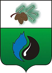 «В серебряном поле выгнутый вправо лазоревый язык пламени и выгнутая влево чёрная капля (друг подле друга), сопровождаемые во главе положенной влево червлёной кедровой ветвью с зелёными иглами и червлёными шишкам»[1].