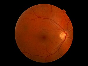 Зрительный нерв (лат. «nervus opticus»), сформированный аксонами ганглиозных клеток сетчатки, осуществляет передачу предварительно обработанной визуальной информации в подкорковые и корковые центры зрительного анализатора. Диск зрительного нерва (лат. «discus nervi optici») лишён фоторецепторных элементов, формируя физиологическую скотому («слепое пятно»)[1].