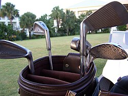 - «Iron» — клюшки, предназначенные для ударов на различные расстояния, в зависимости от положения шара. Их головки металлические и могут иметь разные формы. Для коротких высоких траекторий используется «pitching wedge» с углом наклона головки 50-60°. «Putter» — инструмент для точного удара в зоне «грин»[6].