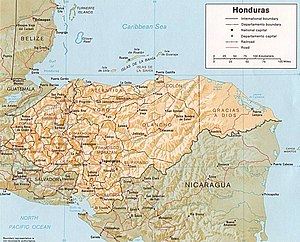 Гондурас — государство в Центральной Америке, расположенное на северной части Центральноамериканского перешейка. С юга страна граничит с Никарагуа, на западе — с Гватемалой, на юго-западе — с Сальвадор. Аквальные границы проходят по водам Карибского моря и его внутреннему углублению — Гондурасскому заливу на севере и востоке, а также по заливу Фонсека в бассейне Тихого океана на юго-западе. В административный состав Гондураса входят многочисленные острова Карибского моря, включая архипелаг Сисне, расположенный в северо-восточной части побережья[29].