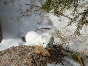 Горноста́й (лат. Mustela erminea) — плотоядное животное из семейства куньих, горностай отличается стройным, гибким телом и короткими конечностями, причём передние лапы несколько короче задних. Передвигается на пальцах. Длина его тела может достигать 38 см, а вес — 280 граммов, при этом самцы заметно больше самок. Голова у него небольшая и узкая, уши маленькие, закруглённые и расставленные широко. Шерсть густая и короткая. Летом его окрас варьируется от рыжевато-коричневого на спине до желтоватого на животе, а зимой становится полностью белым, за исключением кончика хвоста, который всегда остаётся чёрным[1].