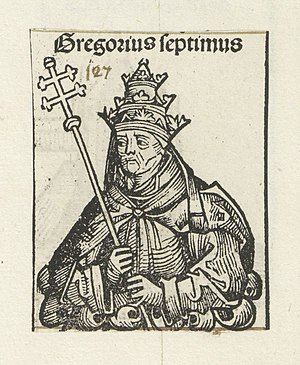 Григорий VII (лат. Gregorius PP. VII; в миру Гильдебранд итал. Ildebrando (или Aldobrandeschi, или Dhiltprandus); между 1020 — 1025[1] — 25 мая 1085) — Папа Римский с 22 апреля 1073 по 25 мая 1085 года. Один из вдохновителей и основных участников Клюнийской и Григорианской реформ. В ходе «Борьбы за инвеституру» возглавлял вооружённую борьбу против императора Священной Римской империи Генриха IV.