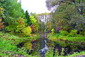 На территории создан каскад прудов, образованных на месте прежнего оврага, включающий 6 плотин. Также присутствует подпитывающийся родниками восстановленный Краськовский пруд, который был заложен монахами в XVI веке. Залегание грунтовых вод в основном происходит на глубине более 9 метров[1].