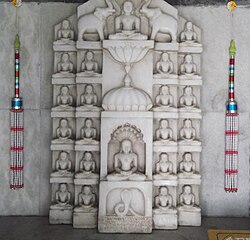 Пантеон джайнов в основном совпадает с индуистским пантеоном, но некоторые боги стоят ниже тиртханкаров и почитаются, в больше мере, как души, ранее находившиеся в человеческих телах и добившиеся освобождения от липкой паутины кармы. Вошел в джайнский пантеон и архаический культ богинь-матерей, выступающих в качестве богинь-посланниц (шасана-деви), которые связывают каждого тиртханкара с миром смертных. Богов и богинь в джайнских храмах изображают по канонам, сложившимся в индуизме, а всех тиртханкаров изображают почти одинаково, различить которых можно только по цвету или по знакам на пьедесталах статуй. 24 тиртханкары: Ришабха (Адинатха), Аджита, Самбхава, Абхинандана, Сумати, Падмапрабха, Супаршва, Чандрапрабху, Пушпаданта (Сувидхи), Шитала, Шреямса, Васупуджья, Вимала, Ананта, Дхарма, Шанти, Кунтху, Ара, Мали, Мунисуврата, Нами, Неми (Ариштанеми), Паршва, Махавира (Вардхамана)[11].