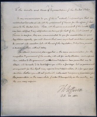 В 1800 году Джефферсон вместе с Аароном Бёрром участвовал в президентских выборах и после победы на выборах джефферсоновских республиканцев в 1801 году вступил в должность президента США на своей инаугурации. В свой кабинет он пригласил представителей обеих враждующих партий, в том числе своего давнего сподвижника Мэдисона на пост государственного секретаря. Джефферсон вступил в должность, полный решимости отказаться от программы федералистов 1790-х годов. Его администрация сократила налоги, государственные расходы и государственный долг, а также отменила законы об иностранцах и подстрекательстве к мятежу. В международных делах основными событиями были покупка Луизианы у Франции в 1803 году, эмбарго на торговлю как с Великобританией, так и с Францией, а также ухудшение отношений с Великобританией, поскольку Соединённые Штаты пытались оставаться нейтральными в разгар Наполеоновских войн, охвативших Европу. Он основал военную академию, использовал военно-морской флот для защиты торговых судов от берберских пиратов в Северной Африке и разработал план защиты портов США от иностранного вторжения с помощью небольших канонерских лодок (план, который оказался бесполезным, когда в 1812 году началась война). Он также разрешил экспедиции Льюиса и Кларка исследовать территорию Луизианы и северо-запад Тихого океана[1][2][3][5].