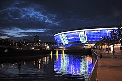 Одной из из ярких достопримечательностей современного Донецка с 2009 года стал футбольный стадион Донбасс-Арена, вмещающий до 50 тысяч зрителей, построенный как домашний стадион для футбольного клуба «Шахтёр»[25]. Одна из главных отличительных черт в дизайне стадиона — полная остеклённость фасада — особенно выразительно смотрится при вечернем освещении. Вокруг стадиона разбит ландшафтный парк. Продолжает спортивную тему расположенный перед комплексом «Олимпийский» прижизненный памятник Сергею Бубке — выдающемуся советскому и украинскому спортсмену по прыжкам с шестом, занесённому в Книгу рекордов Гиннесса за наибольшее количество мировых достижений в лёгкой атлетике[26].