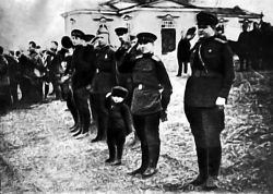 Верховный главнокомандующий Русской армией адмирал А. В. Колчак во время поездки на фронт с сыном полка. 1919 год.