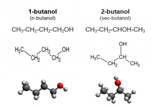 Структурная формула отражает взаимное расположение атомов в молекуле. Приведенная молекулярная формула может принадлежать сразу нескольким веществам, так как гидроксильная группа (-ОН) может располагаться у разных атомов. Под формулой может скрываться бутанол-1 CH3-CH2-CH2-CH2-OH, бутанол-2 CH3-CH2-CH2-CH(OH)-CH3 или бутанол-3 CH3-CH2-CH(OH)-CH3. Эти вещества называются изомерами и имеют разное взаимное расположение атомов[3].