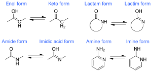Химические соединения, способные к таутомерии, представляют собой смесь двух или нескольких структурно различных соединений, находящихся в состоянии быстрого равновесия. Такое явление называется таутомерией. Когда такое явление имеет место, происходит быстрый перенос атома от одной молекулы к другой и обратно. Почти во всех случаях таким подвижным атомом является водород. Широко распространена таутомерия между карбонильными соединениями, содержащими атом водорода в α- положении, и их енольной формой[4].