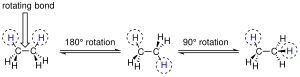 Поворотная изомерия (конформационная изомерия) — явление в химии, при котором молекулы могут принимать различные пространственные формы в результате внутримолекулярного вращения вокруг одной или нескольких простых связей. Такие формы называют конформациями или поворотными изомерами (конформерами). Например, в молекуле этана (Н3С-СН3) при вращении одной группы (-СН3) относительно другой возникает множество неодинаковых форм, среди которых выделяют две характерные конформации (А и Б), отличающиеся поворотом на 60 °[7].