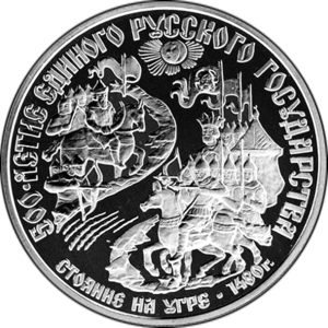 Процесс вхождения калужских земель в состав Московского государства был длительным и сложным. К концу XV века большая часть территории находилась под контролем Москвы. Важнейшим событием этого периода, произошедшим на калужской земле в 1480—1481 годах, стало «Стояние на реке Угре». Это событие, представлявшее собой длительное противостояние русских войск под командованием Ивана III и войск Большой Орды хана Ахмата, завершилось отступлением ордынцев без решающего сражения и традиционно считается концом татаро-монгольского ига на Руси. Река Угра, протекающая по территории современной Калужской области, стала символическим рубежом, ознаменовавшим обретение Русским государством полного суверенитета[11].