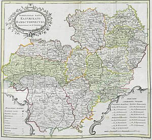 Административно-территориальное оформление региона в рамках Российской империи началось с учреждения Калужского наместничества в ходе губернской реформы Екатерины II. Указом императрицы Екатерины II от 24 августа 1776 года было образовано Калужское наместничество, объединившее Калужскую и Тульскую губернии. Город Калуга был назначен центром наместничества. В этот период город претерпел значительные изменения; его планировка и застройка конца XVIII — начала XIX веков, выполненные по регулярному плану, признаются выдающимся достижением русского градостроительного искусства. Подробное описание региона того времени содержится в историческом документе «Топографическое описание Калужского наместничества», изданном в Санкт-Петербурге в 1785 году[15].