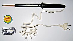 Канифоль — основной флюс в пайке электронных компонентов. При нагреве она удаляет оксидные плёнки с поверхности металлов (меди, олова, серебра), способствуя лучшему смачиванию припоя. Используется в виде твёрдых брусков, порошка, растворов в спирте (спирто-канифольные флюсы) и в составе канифольно-оловянных проволок (самофлюсующиеся припои)[9].