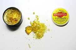 Канифо́ль (от лат. resina — смола, греч. κιναφός — «кинафос») — твёрдая, хрупкая, прозрачная или полупрозрачная смола, получаемая перегонкой живицы хвойных деревьев (в основном сосны, ели, пихты). Является важным природным продуктом, используемым в различных отраслях промышленности, включая музыкальную, химическую, электротехническую, фармацевтическую и пищевую[1][2].