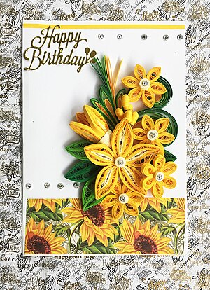 Открытки, выполненные с использованием квиллинга, имеют наибольшую популярность. Более опытные мастера создают на открытках сложные картины. Например, кроме центрального изображения, оформляют фон при помощи тех же модулей или обычной бумаги[13].