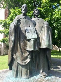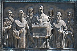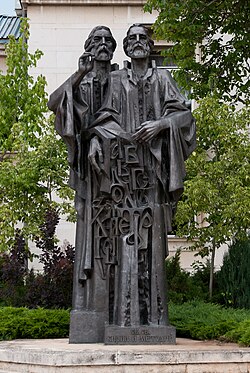 Кири́лл и Мефо́дий — славянские просветители, также известные как Солу́нские братья. Кирилл (около 827 года, Солунь – 14 февраля 869 года, Рим), и Мефодий (около 815 года, Солунь – 6 апреля 885 года, Велеград), прославились как создатели славянского алфавита (глаголицы и кириллицы) и литературного языка. В ранние годы жили в Солуни (Фесалоники, ныне - Салоники), городе со смешанным греко-славянским населением. Для создания письменности на основе бытовавших в разных славянских землях вариантах осуществили экспедицию в Тавриду (Крым). Они были первыми переводчиками богослужебных книг с греческого языка на славянский. Проповедовали и возглавляли епископские кафедры в славянских странах, претерпели гонения со стороны Римской церкви и были канонизированы как святые равноапостольные[1].
