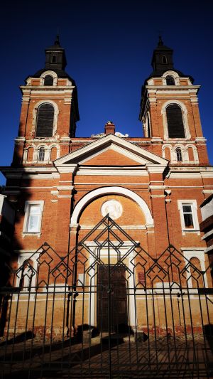 Ещё одним значимым архитектурным объектом города является Александровский костёл. Торжественная закладка костёла состоялась летом 1899 года. Он был создан в честь святого Александра и в память императора Александра III. Проект подготовил архитектор Царства Польского Константин Войцеховский, а работами на месте руководил Иван Чарушин. Работы были завершены в 1903 году, а 31 августа костёл торжественно открыли и освятили. Здание вышло в традиционном католическом стиле, но при этом эклектичное: в нём соединились элементы барокко и романтизма. План храма — латинский крест. Красную кирпичную кладку разнообразили белыми вставками. К концу советской эпохи костёл отреставрировали, обновили витражи, мебель и люстры, отстроили подземный переход с вестибюлем. Немецкая фирма под руководством мастера Герда Майера изготовила орга́н и заработал концертный зал камерной и органной музыки[68].