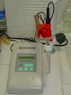 pH-метр — это прибор для быстрого и автоматического контроля кислотности. Он измеряет активность ионов водорода. Принцип работы измерителя рН метра основан на разности потенциалов, которая создается в исследуемой среде между электродами прибора (электродвижущая сила)[17].