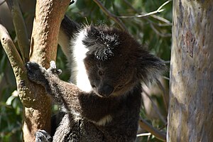 Коа́ла (лат. Phascolarctos cinereus) — сумчатое животное, представленное единственным видом в своём роде и семействе. Обликом оно напоминает маленького медвежонка. Длина тела достигает 82 см, а вес — 16 кг. У животного большая голова с широко расставленными, густо покрытыми мехом округлыми ушами; его короткий хвост практически не виден. На передних лапах первый и второй пальцы противопоставлены остальным. Шерстяной покров густой и мягкий, обычно светло- или тёмно-серого цвета, с беловатым брюшком. Выводковая сумка, хорошо развитая, открывается в задней части тела[1][2].