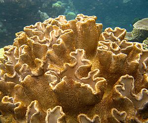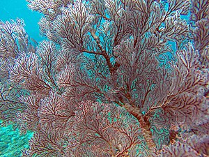 Кора́лл (лат. Alcyoneum) — материал скелета колонии коралловых полипов. Как и у других книдарий, стенка цилиндрического тела одиночного полипа состоит из наружного (эктодерма) и внутреннего (энтодерма) слоёв и находящейся между ними бесструктурной прослойки — мезоглеи. На одном конце тела расположены щелевидное ротовое отверстие, окружённое венчиком из щупалец (их число кратно 6 или равно 8), и глотка, ведущая в слепозаканчивающуюся кишечную (гастральную) полость, на противоположном — подошва (кроме колониальных форм). По углам рта могут находиться желобки, покрытые ресничками (сифоноглифы), по которым вода направляется в гастральную полость и выходит из неё; это облегчает попадание пищи, выведение непереваренных остатков, обеспечивает водный обмен и сохранение формы тела[1].