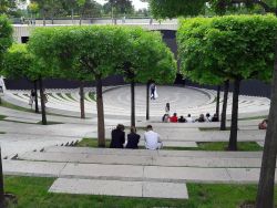 Вокруг площадки, на которой установлены скульптуры, высажены платаны в форме лавочек. Их специальным образом сплели вдруг с другом, чтобы образовать такие вот удобные сиденья. Каменные указатели хорошо вписываются в архитектуру. Мягкие формы знаков и графики делают навигацию по-настоящему «парковой» и роднят её с растительным окружением.