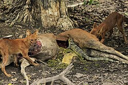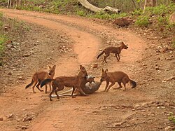 Кра́сный волк (лат. Cuon alpinus) — редкое хищное млекопитающее из семейства псовых, находящееся под угрозой исчезновения. Это уникальный зверь, облик которого сочетает черты волка, лисицы и шакала. Длина тела около 100 см, хвоста — 50 см, масса до 20 кг. Морда сравнительно узкая, укороченная. Уши большие, закруглённые. Шерсть длинная, густая, пушистая. Общий тон окраски рыжий, сильно различающийся у отдельных особей и в разных частях ареала[1][2].