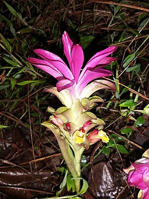 Соцветия куркумы состоят из мелких жёлто-оранжевых цветков, расположенных в пазухах восковых прицветников, которые обычно имеют бледно-зелёную окраску или фиолетовый оттенок. Цветки окружены этими прицветниками, что придаёт соцветию характерный внешний вид[1].
