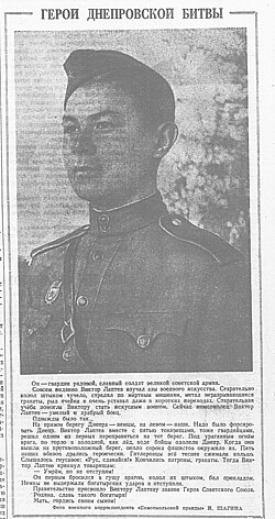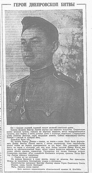 «…Проведя ряд успешных операций, наши части вышли к Днепру. Форсирование началось с ходу. Под ураганным огнём врага, по горло в ледяной воде пять гвардейцев-смельчаков одолели быстрое течение. Они первыми должны были зацепиться за правый берег Днепра, чтобы дать возможность своим боевым товарищам переправиться с меньшими потерями. Как только бойцы вступили на берег, на них со всех сторон набросились десятки гитлеровцев....Слышались крики: «Рус, сдавайся!», но в ответ гремели выстрелы. Когда кончились патроны и гранаты, восемнадцатилетний командир Виктор Лаптев поднялся и крикнул: «Товарищи! Умрём, но не отступим! Вперёд!» Началась рукопашная. Враг не выдержал и отступил...»