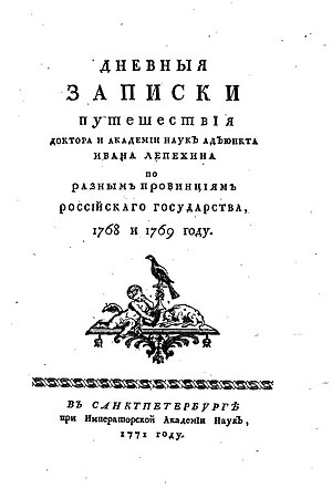 - Дневные записки путешествия доктора и Академии наук адъюнкта Ивана Лепёхина по разным провинциям Российского государства. — СПб.: При Императорской Академии наук, 1771—1805: