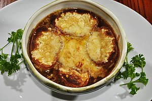 Этот универсальный овощ незаменим в супах, мясном фарше, начинках для пирогов и различных соусах. Кроме того, сушёный и перемолотый лук используют как специю. Среди множества блюд особое место занимает знаменитый французский луковый суп с гренками и сыром[3].
