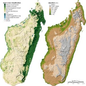 Растительность острова Мадагаскар относится к Мадагаскарской подобласти Палеотропической флористической области. Многие из известных здесь видов (более 6700) являются эндемиками. На острове встречаются равеналия (так называемое дерево путешественников из семейства банановых), орхидея ангрекум и другие эндемики. На восточном побережье и на склонах Высокого плато встречаются отдельные участки постоянно влажных вечнозеленых лесов с ценными породами деревьев из семейств эбеновых, бигониевых и других. Вдоль побережья растет кокосовая пальма. На западе преобладают колючие деревья и кустарники с листьями, опадающими в сухой сезон. Леса Мадагаскара сильно сократились в результате деятельности человека и занимают менее 13 % территории страны. Большую часть поверхности Высокого плато занимает вторичная травянистая саванна с бородатыми и низкорастущими колючими кустарниками. На юго-западе развита травяно-кустарниковая пустыня с млечником канделябровым и др. В целом естественная растительность острова сильно изменена деятельностью человека.